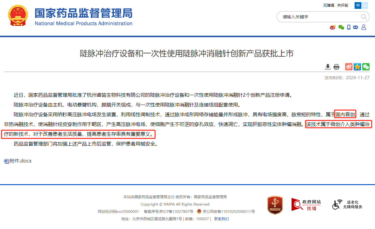 近日,國家藥品監督管理局批準了杭州睿笛生物科技有限公司的陡脈沖治療設備和一次性使用陡脈沖消融針2個創新產品注冊申請。